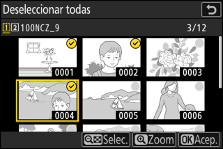 Marque las imágenes y pulse el botón W (Q) para seleccionar; las imágenes seleccionadas están marcadas con una marca de verificación (