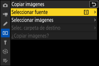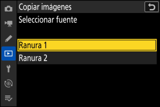 Marque la ranura de la tarjeta que contiene las imágenes que va a copiar y pulse J para seleccionar la ranura marcada y volver al menú [].
