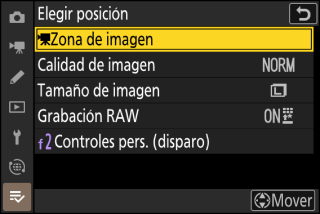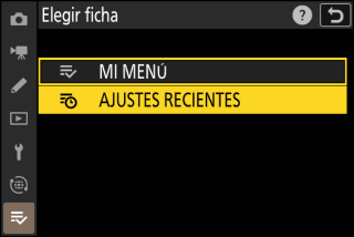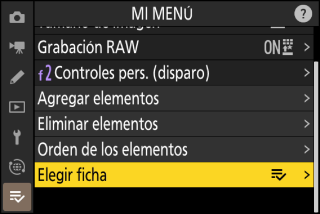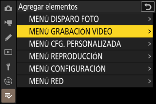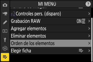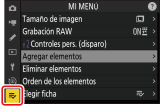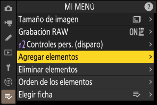 Mi menú puede utilizarse para crear y editar una lista personalizada de hasta 20 elementos de los menús de disparo de foto, grabación de vídeo, configuraciones personalizadas, reproducción, configuración y red. Podrá añadir, eliminar y reordenar elementos tal y como se describe a continuación.