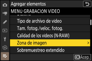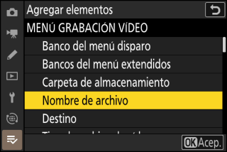 Marque el nombre del menú que contenga el elemento que desea agregar y pulse 2.