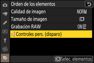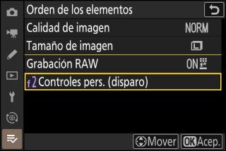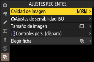 Los elementos de menú se agregarán a la parte superior del menú [] según se usan. Los veinte ajustes más utilizados recientemente se muestran en la