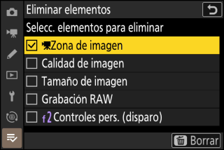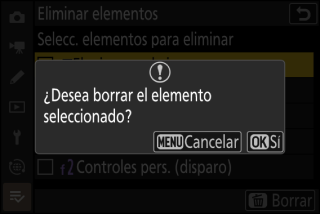 Para eliminar un elemento del menú [], márquelo y pulse el botón O (Q); se mostrará un cuadro de diálogo de confirmación. Vuelva a pulsar O (Q) para eliminar el elemento seleccionado.