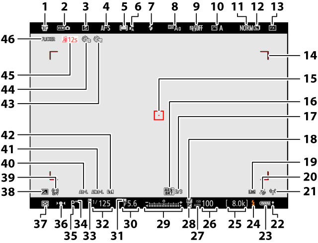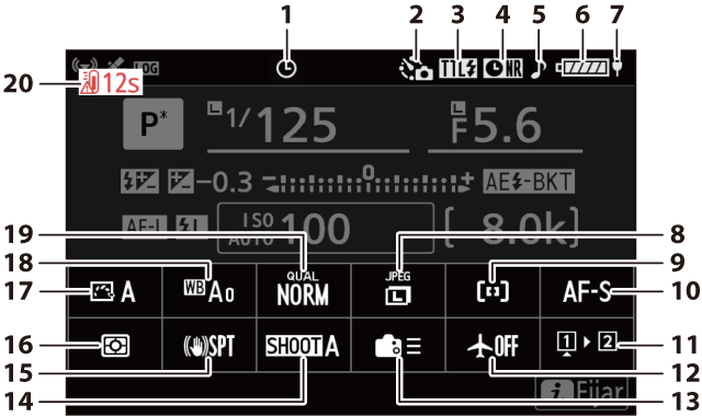 Modo de disparo (Modo de disparo) Capacidad de la memoria intermedia (Modo de disparo) Capacidad de la memoria intermedia (captura de fotogramas a alta velocidad; Captura de fotogramas a alta velocidad (C30/C120)) Indicador de disparo a intervalos (Fotografía con disparo a intervalos) Indicador de vídeo time-lapse (Grabación de vídeos time-lapse) Indicador de desplazamiento de foco (Fotografía con desplazamiento de foco) |