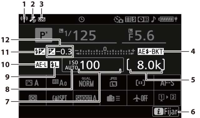 Diafragmas (A (automático con prioridad al diafragma), M (manual)) Incremento de horquillado de la exposición y del flash (Horquillado de la exposición y del flash) Incremento de horq. balance blancos (Horquillado del balance de blancos) Número de tomas en la secuencia de horq. D‑Lighting activo (Horquillado de D‑Lighting activo) Contador de fotogramas del temporizador de intervalos (Fotografía con disparo a intervalos) Recuento de fotogramas de desplazamiento de foco (Fotografía con desplazamiento de foco) Indicador de señal satelital (El indicador de señal satelital) Indicador de conexión Wi‑Fi (Conexión mediante Wi‑Fi (modo Wi‑Fi), LAN inalámbrica, LAN inalámbrica) Indicador de Bluetooth (Emparejamiento (Bluetooth)) Conexión Bluetooth (Software) |