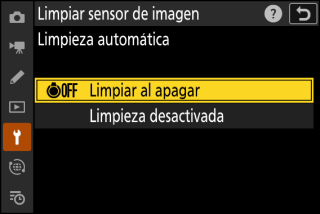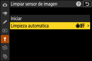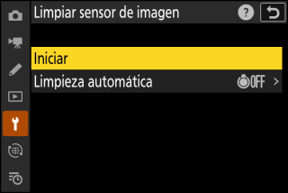 El sensor de imagen puede limpiarse en cualquier momento desde los menús o puede realizar la limpieza automáticamente al apagar la cámara. Si la limpieza del sensor de imagen no consigue resolver el problema, póngase en contacto con un representante del servicio técnico autorizado de Nikon.