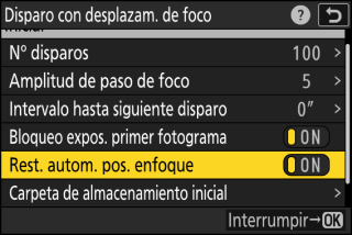 Cuando se seleccione [], el enfoque volverá a la posición de inicio una vez que se hayan realizado todos los disparos de la secuencia actual. Esto le ahorra tener que volver a enfocar cada vez que fotografíe sujetos a la misma distancia de enfoque varias veces seguidas.