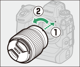 Alignez le repère de montage de l’objectif sur le repère correspondant du boîtier de l’appareil photo (q) et tournez l’objectif dans le sens indiqué (w).