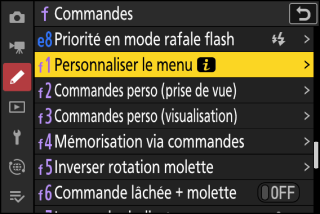 Mettez en surbrillance le réglage personnalisé f1 ou g1 [] et appuyez sur J.