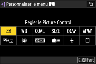 Vous pouvez choisir les rubriques affichées dans le menu i pendant la prise de vue à l’aide du réglage personnalisé f1 ou g1 [].