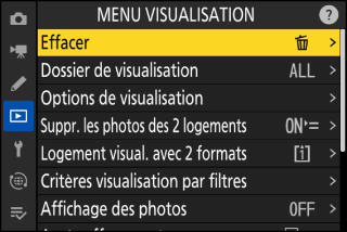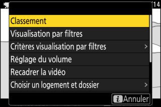 Lorsque vous appuyez sur la commande i lors de la visualisation, un menu i dont les options varient selon le contexte s’affiche ; il comporte les options de visualisation.