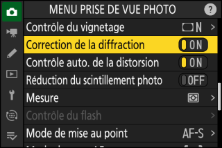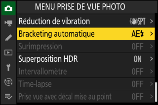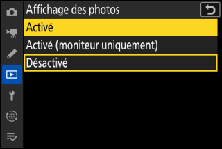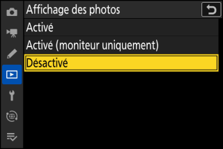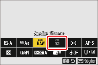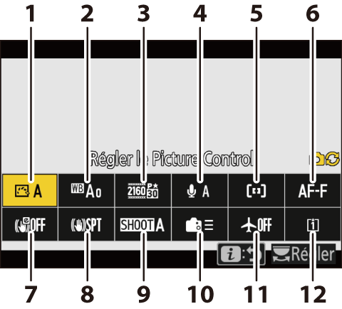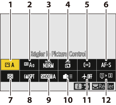 Lorsque vous appuyez sur la commande i en mode photo, les rubriques indiquées ci-dessous s’affichent. Mettez en surbrillance la rubrique souhaitée à l’aide du sélecteur multidirectionnel et appuyez sur J pour afficher les options.