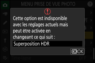 Dans certains cas, si vous appuyez sur J lorsqu’un élément grisé est en surbrillance, un message expliquant pourquoi l’élément est indisponible s’affiche.
