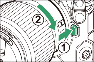 Après avoir mis l’appareil photo hors tension, maintenez appuyée la commande de déverrouillage de l’objectif (q) tout en tournant ce dernier dans le sens indiqué sur l’illustration (w).