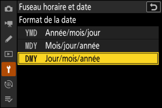 Mettez en surbrillance l’ordre d’affichage de la date (année, mois et jour) souhaité et appuyez sur J.