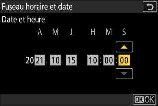 Appuyez sur J après avoir utilisé le sélecteur multidirectionnel pour régler l’horloge sur la date et l’heure du fuseau horaire sélectionné sur l’écran [] (notez que l’appareil photo dispose d’une horloge de 24 heures).
