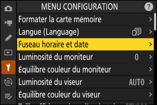 Mettez en surbrillance un fuseau horaire sur l’écran [] et appuyez sur J.