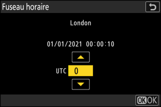 L’écran indique certaines villes du fuseau choisi et la différence entre l’heure du fuseau choisi et l’UTC.