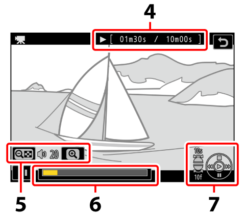 Lors de la lecture d’une vidéo, la durée de cette dernière, la position de lecture actuelle et les autres indicateurs répertoriés ci-dessous sont affichés. Vous pouvez également vérifier votre position approximative dans la vidéo à l’aide de la barre d’avancement.