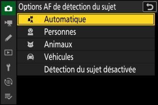 Si [] est sélectionné, l’appareil photo détecte les êtres humains, les animaux et les véhicules et choisit le sujet sur lequel il effectue la mise au point automatiquement.
