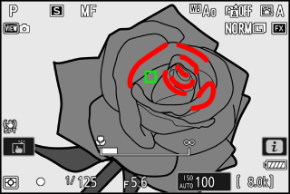 Si [] est sélectionné pour le réglage personnalisé a13 [] > [], les contours des objets nets s’affichent en couleur lorsque vous effectuez la mise au point manuellement.