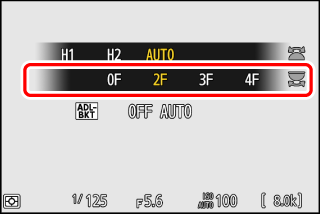 Pour annuler le bracketing, appuyez sur la commande BKT et tournez la molette de commande principale jusqu’à obtenir zéro pour le nombre de prises de vues de la séquence de bracketing (0F). Le dernier programme utilisé est rétabli lors de la prochaine activation du bracketing. Vous pouvez également annuler le bracketing en effectuant une réinitialisation par deux commandes (Réinitialisation par deux commandes), bien que dans cette situation, le programme de bracketing ne soit pas rétabli lors de la prochaine activation du bracketing.