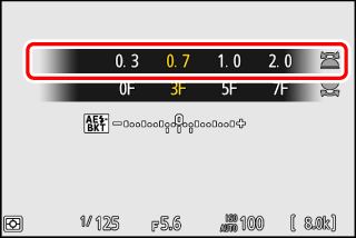 Lorsque [] est sélectionné pour le réglage personnalisé b2 [], vous avez le choix entre un incrément de 0,3 (1/3), 0,7 (2/3), 1, 2 et 3 IL. Les programmes de bracketing dont l’incrément est de 2 ou 3 IL permettent de réaliser jusqu’à 5 vues. Si vous avez sélectionné une valeur de 7 ou 9 à l’étape 1, le nombre de prises de vues se règle automatiquement sur 5.