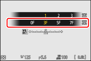 Maintenez appuyée la commande BKT et tournez la molette de commande secondaire pour choisir l’incrément de la balance des blancs.