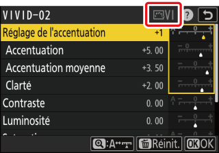 Le repère j se trouvant sous une valeur dans le menu de réglage des Picture Control indique la