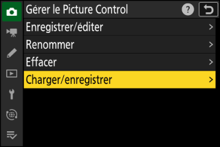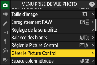 Sélectionnez [] dans le menu Prise de vue photo ou Enregistrement vidéo, puis mettez en surbrillance le Picture Control souhaité et appuyez sur 2.