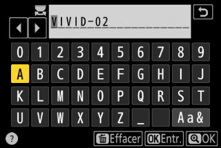 Le nom par défaut, créé en ajoutant un nombre à deux chiffres au nom du Picture Control existant, s’affiche dans la zone d’affichage du texte. Ce nombre à deux chiffres est généré automatiquement par l’appareil photo.
