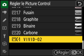Si vous mettez en surbrillance [] dans le menu i et que vous appuyez sur J, une liste de Picture Control s’affiche. Mettez en surbrillance un Picture Control