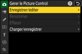 Créez un nouveau Picture Control personnalisé basé sur un Picture Control existant (prédéfini ou personnalisé) ou modifiez des Picture Control personnalisés existants. |