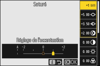 Lorsqu’un Picture Control créatif est sélectionné, vous pouvez choisir le niveau de l’effet en maintenant appuyée la commande g (Fn4) et en tournant la molette de commande secondaire.
