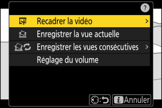 Pour supprimer uniquement la fin de la vidéo, mettez en surbrillance [] et appuyez sur J à l’étape 4, sélectionnez la dernière vue et passez à l’étape 7 sans appuyer au centre du sélecteur secondaire à l’étape 6.