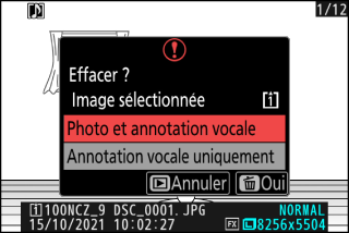 Pour supprimer l’annotation vocale de la photo en cours, appuyez sur la commande O (Q) ; une boîte de dialogue de confirmation s’affiche comme sur l’illustration.
