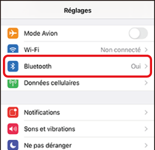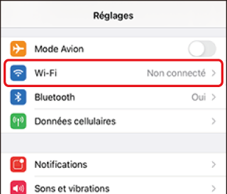 Sur les périphérique iOS, l’application « Réglages » démarre. Touchez [] pour ouvrir [], puis faites défiler vers le haut et touchez [] (qui figure en haut de la liste des réglages) pour afficher les réglages Wi‑Fi.