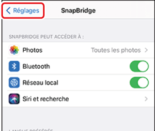 Périphérique mobile : après avoir modifié les réglages du périphérique comme décrit à l’étape 4, revenez à l’application SnapBridge.