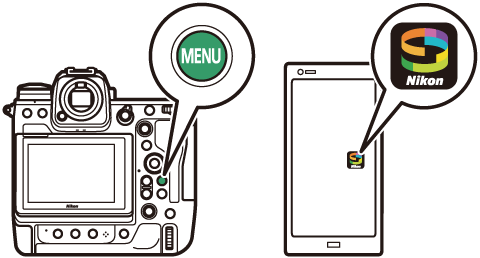 Utilisez l’application SnapBridge pour établir des connexions sans fil entre l’appareil photo et votre périphérique mobile. Vous pouvez vous connecter soit en Bluetooth (Connexion en Bluetooth (association)), soit en Wi‑Fi (Connexion en Wi‑Fi (mode Wi‑Fi)). La connexion en Bluetooth permet de transférer les photos automatiquement au fur et à mesure de la prise de vue.