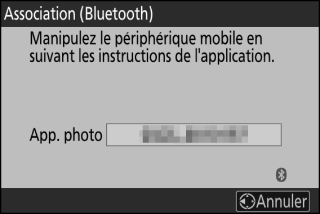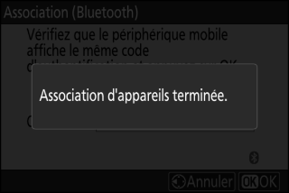 L’appareil photo et le périphérique mobile affichent tous les deux un message une fois l’association effectuée. L’appareil photo revient ensuite automatiquement aux menus.