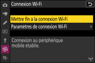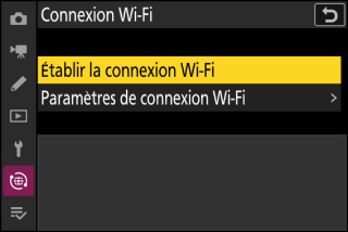 Appareil photo : sélectionnez [] > [] dans le menu Réseau, puis mettez en surbrillance [] et appuyez sur J.