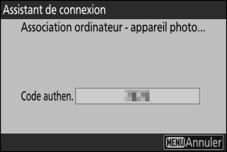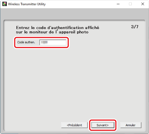 Dans Wireless Transmitter Utility, saisissez le code d’authentification affiché par l’appareil photo.