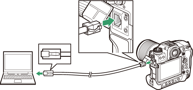 L’appareil photo peut se connecter aux ordinateurs soit directement, soit via des réseaux existants à l’aide d’un câble Ethernet tiers inséré dans la prise Ethernet de l’appareil photo.