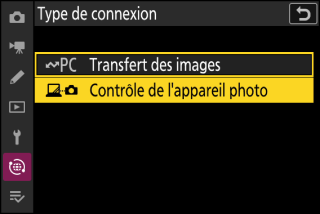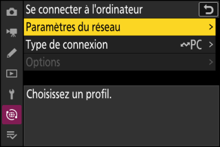 Avant d’utiliser Camera Control Pro 2 ou NX Tether, connectez l’appareil photo et l’ordinateur en Ethernet ou via un réseau sans fil. Connectez-vous à l’aide d’un profil hôte sélectionné via la liste [] > [] du menu Réseau.