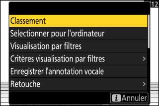 La rubrique [] du menu i de visualisation permet d’afficher uniquement les images répondant aux critères choisis (Visualisation par filtres). Vous pouvez alors sélectionner toutes les images pour le transfert en mettant en surbrillance [] dans le menu i et en appuyant sur J.