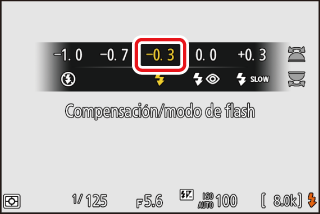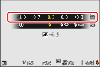 Vous pouvez afficher la correction du flash sur l’écran de prise de vue et sur l’écran de contrôle en appuyant sur la commande c.