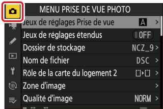 Pour afficher le menu Prise de vue photo, sélectionnez l’onglet C dans les menus de l’appareil photo.