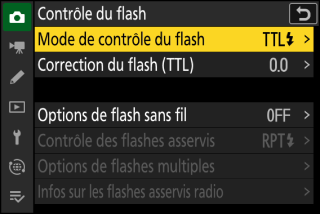Choisissez le mode de contrôle des flashes asservis. Vous pouvez modifier les options de flash sur l’affichage de contrôle du flash ; les options disponibles dépendent de l’option sélectionnée pour [].