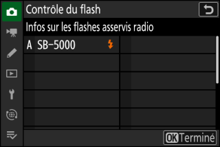 Les réglages des flashes autres que les SB‑5000, SB‑500, SB‑400 et SB‑300 peuvent uniquement être modifiés à l’aide des commandes du flash.