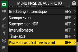 Le décalage de la mise au point fait varier automatiquement la mise au point sur une série de vues. Utilisez cette fonction pour prendre des photos qui seront ensuite assemblées à l’aide du procédé de « focus stacking » afin de créer une seule photo à la profondeur de champ étendue. Avant d’utiliser le décalage de mise au point, choisissez le mode de mise au point AF‑S ou AF‑C et un mode de déclenchement différent du retardateur ou de la prise de vue haute vitesse.