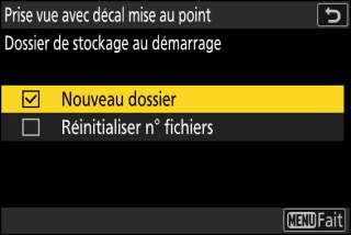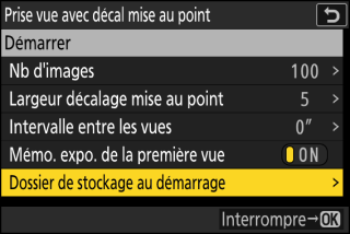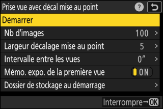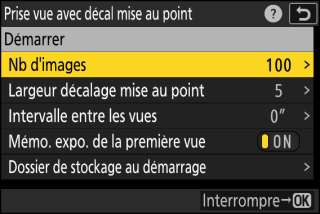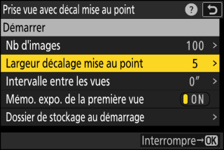 L’appareil prend les photos selon l’intervalle sélectionné, en commençant par la distance de mise au point sélectionnée au démarrage de la prise de vue et en progressant jusqu’à l’infini selon la largeur de décalage sélectionnée pour chaque prise de vue.